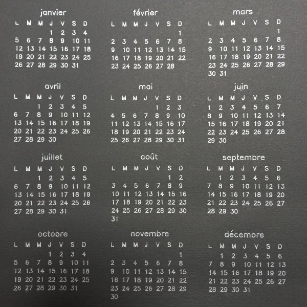 Réalisé avec la cameo 4 à partir d'un fichier vectoriel inkscape et inkscape-silhouette. La théière est un fichier SVG classique, chque élément mensuel du calendrier a été réalisé avec un script python, puis modifié dans inkscape pour utiliser une typo adaptée au tracé.