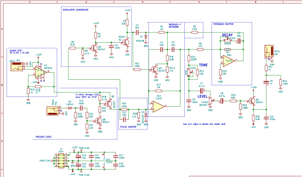 J'ai donc ajouter un étage d'amplification à l'entrée accent pour accepter du CV 0-5V et l'amplifier en 0-12V (pas tout à fais 12V selon les caractéristiques de l'aop). Je peux donc moduler l'amplitude du kick en fonction de la tension envoyer par CV.