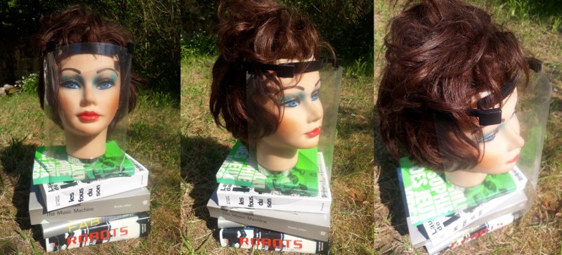 Depuis le 7 avril nous avons rejoint le réseau Visières 29 d'impression 3D de visières de protection pouvant être utilisée par les personnes en contact avec du public. La visière est composée d'une pièce serre-tête posée sur le front (impression 3D), de boucles pour tenir l'élastique (impression 3D), d'une feuille de rhodoïd 200 microns (plastique transparent pour la reliure) et d'un élastique. Les modèles 3D sont dérivés du modèle Newshield, mais ce n'est pas très clair