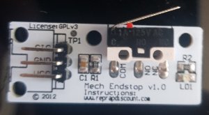 Nous avons utilisé des endstops vendus sous forme de module par reprapdiscount.com, du type “Mech endstop v1.0” (lien). Ils sont composés d'un microrupteur, d'une led et de quelques composants annexes.
