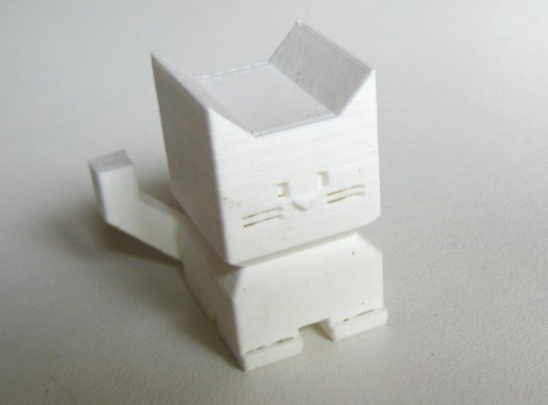 Premier test à 0.12mm (à droite sur la photo), vitesse d'impression 20mm/s, avec support, sans socle, les autres réglages sont ceux du profile “Fine 0.1mm” de Cura 3.5.1. L'impression est de bonne qualité, c'est bien détaillé, avec des défauts sur les doigts, le support s'enlève correctement. On voit à peine les couches.