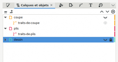 Le fichier inkscape comporte 3 calques : dessin, coupe et plis. Ces 3 calques sont établis à partir du fichier SVG exporté depuis Blender.