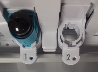 Chaque lame porte un chiffre (1 ou 2) qui indique dans quel porte-outil elle peut être placée. Tirer légèrement le porte-outil vers vous. Insérer la lame dans le porte-outil adapté (1 ou 2). Appuyer légèrement sur la lame, de haut en bas et pousser le porte-outil pour le refermer. Si la lame est bien placée, un petit voyant sera bleu sur le support de la lame (1 sur l'image, le 2 a un petit voyant noir).