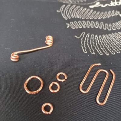 À droite, des petites pièces conductrices en cuivre réalisées à partir de chutes de fil électrique et d'une pince…