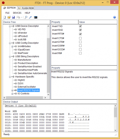 - dans le device tree à gauche, choisir “Hardware Specific / Invert RS232 Signals”