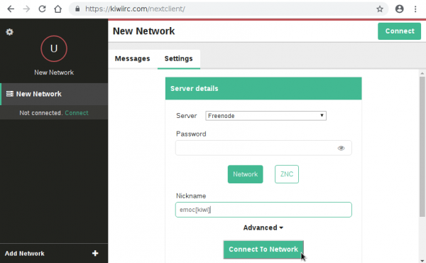 Dans networks settings, choisir Freenode dans la liste des serveurs et un pseudo, le mot de passe n'est pas nécessaire