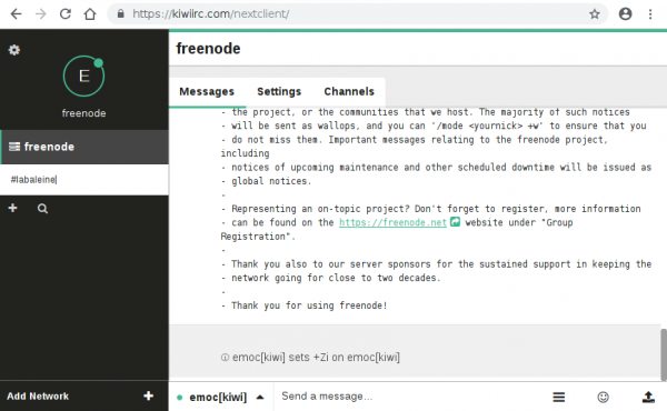 Tout en haut ( emoc @ freenode / #labaleine) mon pseudo @ le réseau / le salon affiché en dessous.