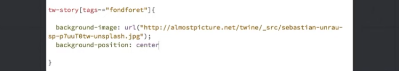 On peut intégrer une image avec la balise html <img src="image.jpg" width="100%"> pour l’intégrer dans un passage, ou avec la propriétés css background-image associée à un tag pour une image de fond, cf. https://www.youtube.com/watch?v=YEDdbehQL6s L’usage des liens relatifs pose problème car les actions test et play dans Twine renvoient vers un fichier temporaire (dans le répertoire file:///home/emoc/Documents/Twine/Scratch/ ) mais ça fonctionne si on build le jeu. Des personnes ont proposé des solutions (lien symbolique entre les dossiers, cf. https://intfiction.org/t/a-method-for-using-relative-media-links-for-twine-development-on-windows/66637)
