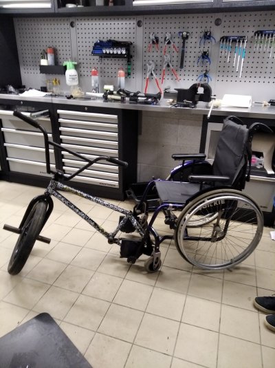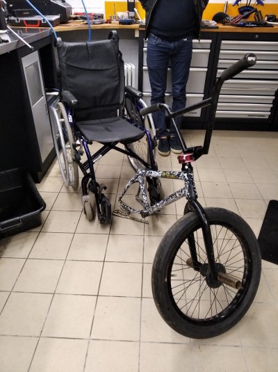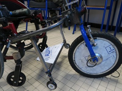Réunions tenues : mardi 05/11, mardi 26/11 à 17h30 puis mercredi 04/12 à 17h30 Lors de ces réunions, des tests grandeur nature ont été réalisés avec un cadre de vélo bmx ayant une roue de 20 pouces. Les tests ont consisté à réfléchir à l'usage de ce vélo en fonction de ces capacités motrices et sa posture habituelle. Un des points importants à prendre en compte et d'avoir un espace évidé sous le fauteuil afin que Christophe puisse fléchir sa jambe. Cela lui permettra de manœuvrer et changer de direction plus facilement.