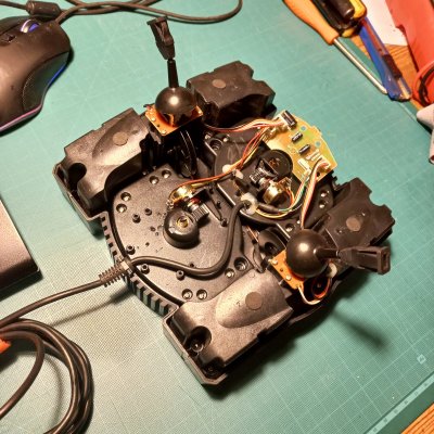 Avant de découvrir tout ça, je l'ai démonté pour vérifier que tout ça se passe bien au niveau des capteurs (et lire la version du pcb), à l'intérieur on trouve 2 doubles potentiometres pour XY, type joystick, assez classiques et 2 potentiometres qui mesurent l'élongation en Z avec un système de poulies. C'est quand même bien ingénieux tout ça!