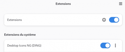 Pour les icônes du bureau, GNOME 48 (la version au moment de la rédaction) ne les propose nulle part d'origine. Il faut installer Extensions afin de pouvoir gérer toutes les extensions qui nous seront nécessaire, et une première extension, “gnome-shell-extension-desktop-icons” (ici, il a été installé en ligne de commande avec apt). Il faudra ensuite l'activer en ouvrant Extensions.