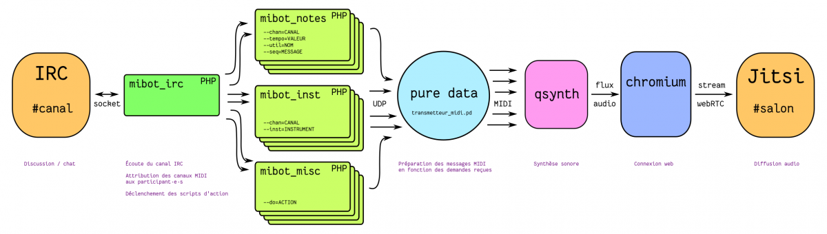 Le bot en php écoute les discussions d'un canal IRC et transforme ce que chaque participant·e écrit en notes MIDI qui sont envoyées à un synthé logiciel (qysnth) qui génère les sons, le résultat est streamé vers un serveur icecast, le résultat est streamé en utilisant un serveur WebRTC, généreusement public, dont la latence est plus adapté à une transcription en temps réel.