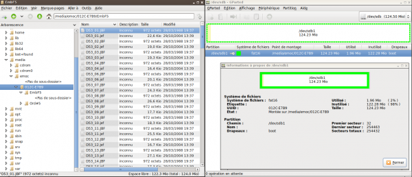 La carte est formatée en fat16, elle contient deux dossiers (EmpF5 et Ord#5). Seul le dossier EmbF5 contient des fichiers : il y en a deux pour chaque motif : un fichier .JBF et un fichier .jef