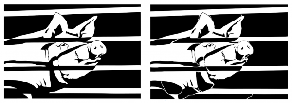 Afin que les différents éléments du pochoir se tiennent bien à l'étape de découpe, il faut éviter les «îles», c'est à dire des morceaux isolés que rien ne retient. Pour cela on place des «ponts» entre les différents éléments. Exemple : à gauche l'image originale, à droite le pochoir avec ponts.