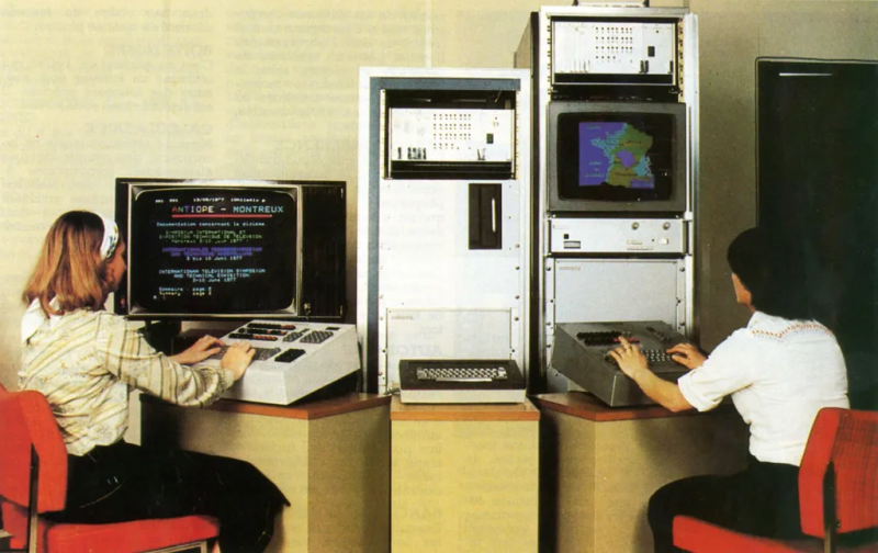 1979, CCETT’s Antiope « Antiope est l'acronyme d'Acquisition numérique et télévisualisation d'images organisées en pages d'écriture. Système français de télétexte et Vidéotex utilisé en télédiffusion dans les années 1980. Ce système de transmission de données numériques exploite les lignes invisibles du signal de télévision retransmis en analogique. Il a principalement été associé au standard Sécam. » (wp)