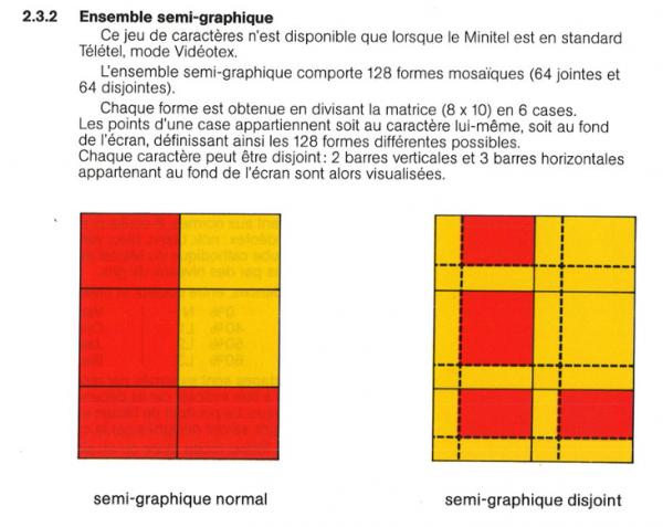 «L'écran du Minitel est une matrice texte d'une taille de 25 lignes par 40 colonnes en mode Vidéotex (8 nuances de gris) et se base sur un système de codage qui lui est propre. Un jeu de caractères graphiques, chacun constitué de 6 gros pixels, lui permet d'afficher des images en mode « mosaïque », un peu à la manière de l'art ASCII.» (wp)