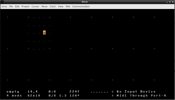 Orca est un langage ésotérique de création de séquenceurs, capable d'envoyer des informations de contrôle en MIDI, OSC ou UDP à des logiciels musicaux ou audiovisuels. Il permet de construire des séquences complexes par un langage spécifique composé d'instructions réduites à une lettre. C'est un environnement de création pour le livecoding audio-visuel, qui ressemble à un croisement entre l'assembleur et le jeu de la vie de Conway