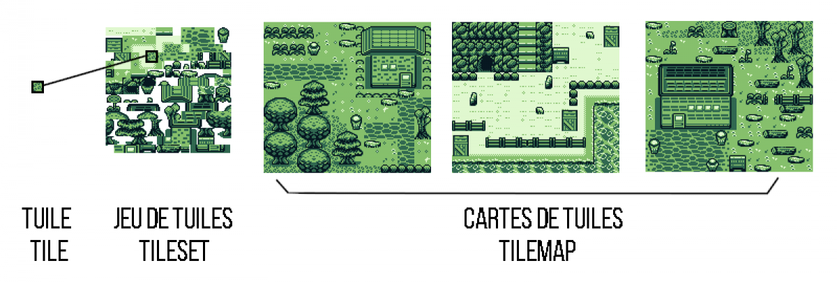 Tilemap (carte de tuile) : Une carte de tuile arrange différentes tuiles pour dessiner un niveau. On la compose facilement en piochant les tuiles dans le jeu de tuile et en les dessinant sur la grille.
