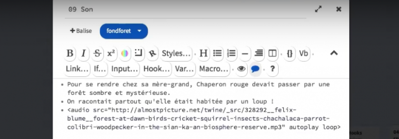 (menu histoire / feuille de style) Mise en forme : directement dans le passage ou par un ensemble regles CSS Balises : on peut ajouter des tags aux passages, par exemple pour les styler différemment en CSS