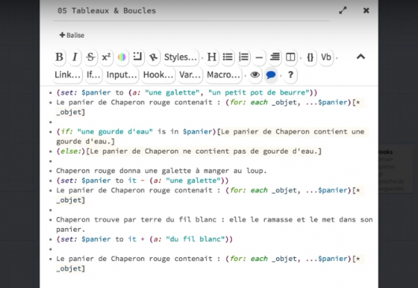 Les hooks : identification d’un élément qui pourra être manipulé par du code, on place l’élément entre crochet carré et on peut le nommer, voir exemple ci-dessous (cf. https://www.youtube.com/watch?v=E6zOa1lEJCE)