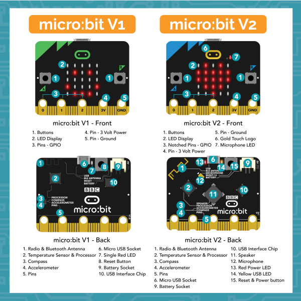 Caractéristiques détaillées en fonction de la version : https://tech.microbit.org/hardware/