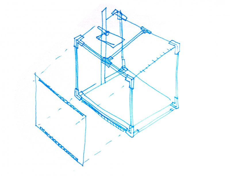 Premier croquis, une structure en tube IRO porte deux morceaux de styroglass translucide qui diffuseront la lumière projetée de l'extérieur. La structure en tubes IRO est assemblée à partir de pièces de raccord imprimées en 3D.