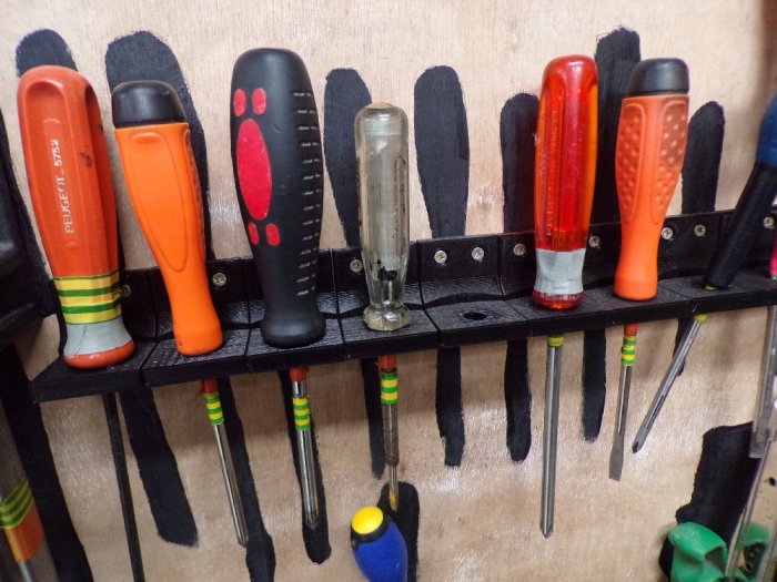 Un porte tournevis à fixer, l'objet 3D est réalisé avec openscad, sous forme de code paramétrique, on peut modifier ses dimensions pour l'adapter à ses besoins.