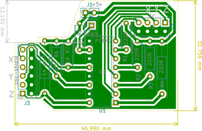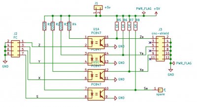 D'après la documentation de grbl un circuit permet de réduire ces parasites. Ce circuit se base sur un optocoupleur. Le circuit créer utilise un quadruple optocoupleur et permet de se brancher directement sur le cnc-shield. Il n'y à qu'à brancher les les fins de courses et l'alimentation +5V. Voici les fichiers kicad de cette version