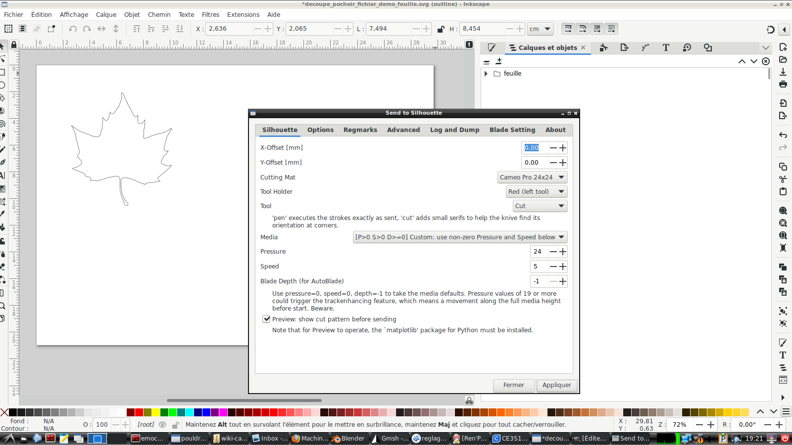 Le fichier inkscape comporte 1 calque de découpe, à sélectionner puis «extensions > export > send to silhouette», définir les paramètres, appliquer : l'opération démarre.