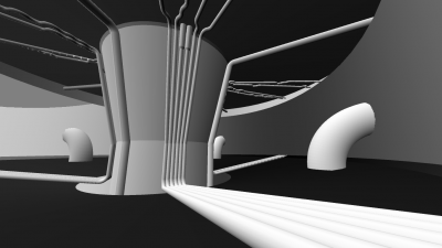 import queasycam.*; import com.badlogic.gdx.math.*; static final Vector3 xAxis = new Vector3(1.0, 0.0, 0.0); static final Vector3 yAxis = new Vector3(0.0, 1.0, 0.0); static final Vector3 zAxis = new Vector3(0.0, 0.0, 1.0); QueasyCam cam; boolean wireframe = false; ArrayList<Drawable> objects = new ArrayList(); public void setup() { fullScreen(P3D); cam = new QueasyCam(this, PConstants.PI/2.5f, 0.01, 9999); cam.key_forward = 'z'; cam.key_left = 'q'; cam.key_backward = 's'; cam.key_right = 'd'; cam.key_up = 'e'; cam.key_down = 'a'; // Center tower Pipe pipe = new Pipe( new Vector3(0.0, 800, 0.0), new Quaternion().setFromAxis(zAxis, -90), 550, 64); pipe.addTube(1000); pipe.changeSize(800); pipe.addTube(1000); pipe.changeSize(820); pipe.addTube(20); pipe.changeSize(2600); pipe.addTube(200); pipe.addTube(-400); objects.add(pipe); // Surrounding circus pipe = new Pipe( new Vector3(0.0, 800, 0.0), new Quaternion().setFromAxis(zAxis, -90), 800, 64); pipe.addTube(600); pipe.changeSize(2000); pipe.addTube(200); pipe.changeSize(2040); pipe.addTube(40); pipe.addTube(1000); objects.add(pipe); for (int r=0; r<4; r++) { Quaternion rot = new Quaternion().setEulerAngles(r * 90, 0, 9); for (int i=0; i<6; i++) { Vector3 pos = new Vector3(-2100, 298, (i-3)*34 + 17); rot.transform(pos); pipe = new Pipe(pos, rot, 16, 16); pipe.addTube(1480 + 4 * abs(i-3)); pipe.addBend(99, 180); pipe.addTube(300, (3-i) * 5); pipe.addBend(14); if (abs(i-2.5)<=1) { pipe.addTube(860); pipe.changeSize(24); pipe.addTube(18); pipe.changeSize(26); pipe.addTube(200); } else { pipe.addTube(1000); pipe.addBend(70); float l=0.0, ll=0.0; int state = 0; // -1: left; 0: center; 1: right while (l<1800) { int turn = floor(random(3.0)-1.0); if (state==0 && turn == -1) { pipe.addBend(45, 90); state = -1; } else if (state==0 && turn == 1) { pipe.addBend(45, -90); state = 1; } else if (state == -1 && turn == 1) { pipe.addBend(45, 180, -90); state = 0; } else if (state == 1 && turn == -1) { pipe.addBend(45, -180, 90); state = 0; } else if (state == 0) { pipe.addTube(ll); l += ll; ll = 0.0; } ll += 100; } } objects.add(pipe); } float deg = r * 90 + 45; rot.setFromAxis(zAxis, -90); rot.mul(new Quaternion().setFromAxis(xAxis, deg)); Vector3 pos = new Vector3(590 * cos(radians(deg)), 800, 590 * sin(radians(deg))); pipe = new Pipe(pos, rot, 34, 16); pipe.addTube(980); pipe.addBend(14); pipe.addTube(950); pipe.addBend(70); pipe.addTube(1800); objects.add(pipe); deg = r * 90 + 45; rot.setFromAxis(zAxis, -90); rot.mul(new Quaternion().setFromAxis(xAxis, deg)); pos = new Vector3(1700 * cos(radians(deg)), 50, 1700 * sin(radians(deg))); pipe = new Pipe(pos, rot, 140, 32); pipe.addBend(90, 0, 0, 300); objects.add(pipe); } } public void draw() { background(0); //lights(); //ambientLight(12, 4, 1); //pointLight(100, 100, 110, 140, -2000, 144); directionalLight(204, 204, 204, .5, 0.6, 0.2); emissive(50, 46, 51); //specular(204, 102, 0); shininess(1.0); strokeWeight(1); stroke(255, 0, 0); line(0, 0, 0, 100, 0, 0); stroke(0, 255, 0); line(0, 0, 0, 0, 100, 0); stroke(0, 0, 255); line(0, 0, 0, 0, 0, 100); if (wireframe) stroke(0); else noStroke(); strokeWeight(1); for (Drawable o : objects) o.draw(); } void keyPressed() { if (key == 'w') wireframe = !wireframe; } public interface Drawable { public void draw(); public void update(); } public interface Chainable extends Drawable { public Vector3 getOutPos(); public Quaternion getOutOrientation(); } /***************************** ** class Pipe ** *****************************/ public class Pipe implements Drawable { private Vector3 pos; private Quaternion orientation; private float radius; private float nextRadius; private int faces; private ArrayList<Chainable> objects = new ArrayList(); private Vector3 currentPos; private Quaternion currentOrientation; public Pipe(Vector3 pos, Quaternion orientation, float radius, int faces) { this.pos = pos; this.orientation = orientation; this.radius = radius; this.nextRadius = radius; this.faces = faces; currentPos = this.pos.cpy(); currentOrientation = orientation.cpy(); } public void changeSize(float next) { this.nextRadius = next; } private void add(Chainable object) { objects.add(object); currentPos = object.getOutPos(); currentOrientation = object.getOutOrientation(); radius = nextRadius; } public void addTube(float len) { addTube(len, 0.0); } public void addTube(float len, float twist) { Tube tube = new Tube( currentPos, currentOrientation, len, radius, nextRadius, twist, 1, faces ); add(tube); } public void addBend(float angleBendDeg) { addBend(angleBendDeg, 0.0, 0.0); } public void addBend(float angleBendDeg, float angleRotDeg) { addBend(angleBendDeg, angleRotDeg, 0.0); } public void addBend(float angleBendDeg, float angleRotDeg, float twist) { float radInt = 50; addBend(angleBendDeg, angleRotDeg, twist, radInt); } public void addBend(float angleBendDeg, float angleRotDeg, float twist, float radInt) { int rings = ceil(angleBendDeg * 64.0 / 360.0); currentOrientation.mul(new Quaternion().setEulerAngles(0, angleRotDeg, 0)); Bend bend = new Bend( currentPos, currentOrientation, radius, nextRadius, radians(angleBendDeg), radInt, twist, rings, faces ); add(bend); } public void update() { for (Chainable o : objects) o.update(); } public void draw() { for (Chainable o : objects) { o.draw(); } Vector3 head = currentOrientation.transform(new Vector3(32, 0, 0)); head.add(currentPos); line(currentPos.x, currentPos.y, currentPos.z, head.x, head.y, head.z); } } /***************************** ** class Tube ** *****************************/ public class Tube implements Drawable, Chainable { private Vector3 pos; private Quaternion orientation; private float len; private float radiusIn; private float radiusOut; private float twist; private int rings; private int faces; private Vector3[] points; private Vector3 tmpVec = new Vector3(); private Vector3 outPos = new Vector3(); private Quaternion outOrientation = new Quaternion(); public Tube( Vector3 pos, Quaternion orientation, float len, fl