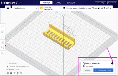 La durée d'impression estimée s'affiche et il est possible d'avoir plus de détails en cliquant sur le i
